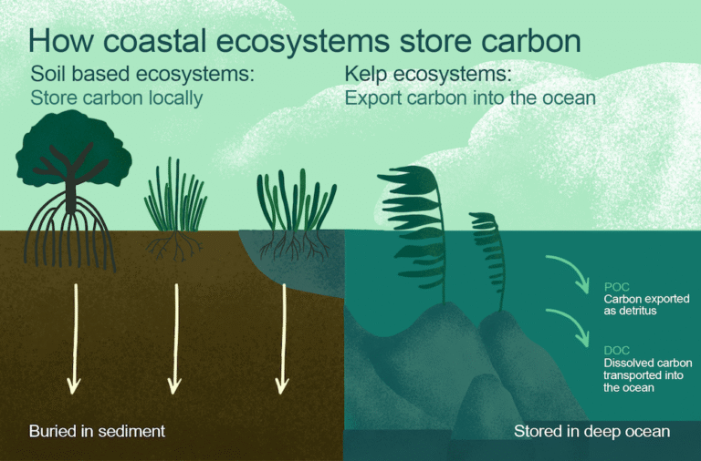Unlike soil-based blue carbon habitats that lock carbon beneath them, kelp carbon is exported away from where it’s produced, making it harder to track but possible to model using oceanographic tools.